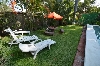 Jardín pequeño con sombrilla y 2 camastros. Posibilidad de usar terreno aledaño con pasto con columpios |
